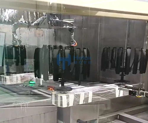 Flat spraying and rotary spraying, flat spraying workpiece disk size:L1600mm*W800mm*H300mm, Rotary spraying workpiece disk size: diameter 700mm, spraying products up to600mm, the design of the production beat 110S.Features of spraying line: off-line spraying, two spraying modes, flexible application, double-disk rotary spraying, high production efficiency, applicable to different products and spraying methods.Equipped with automatic knowledge system, precision flow control system, two-component paint online automatic proportioning system, the whole line realizes fully automated production and data-based intelligent production.